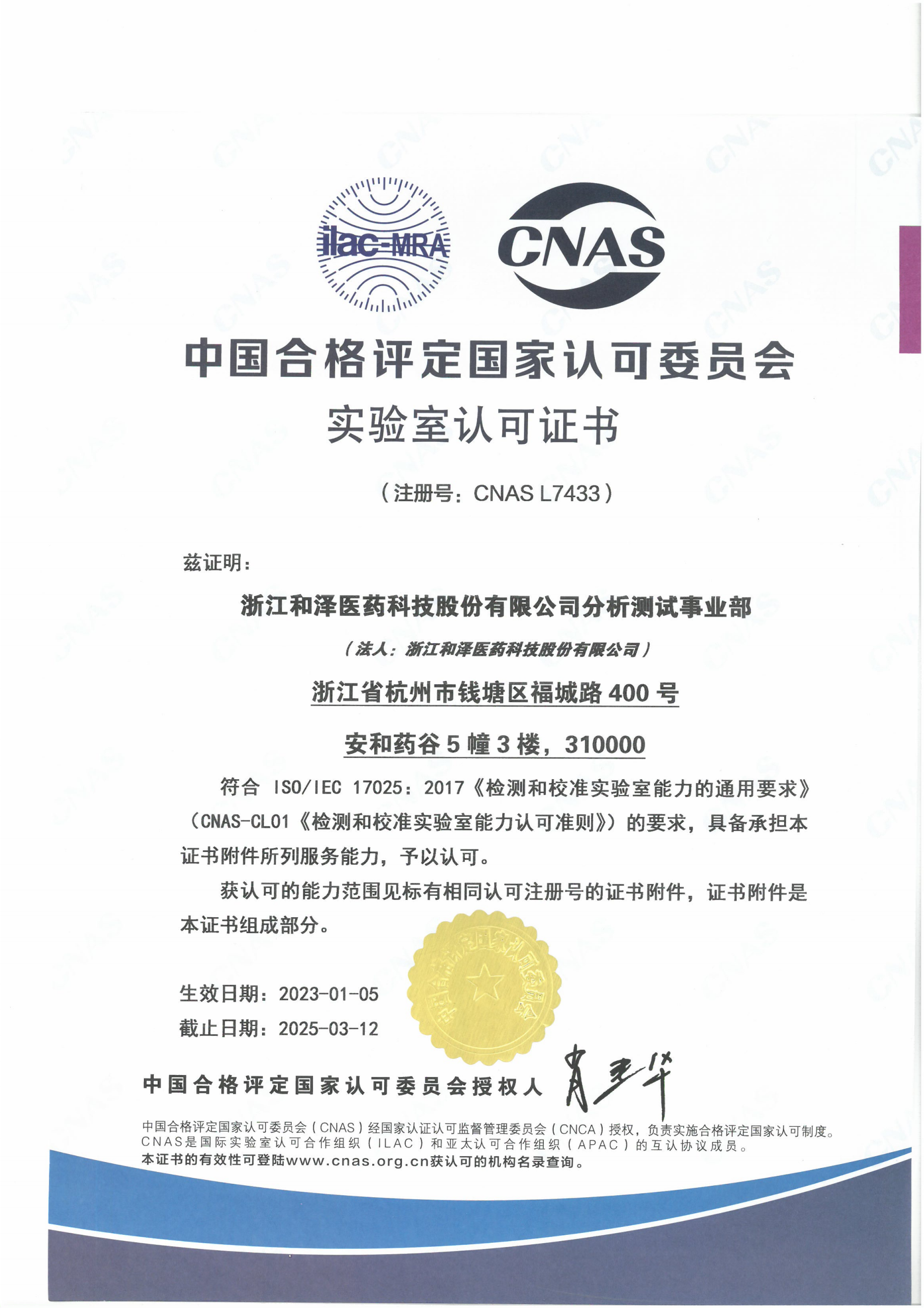 实验室认可证书
